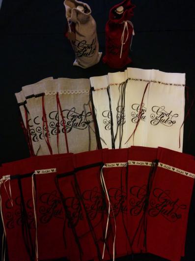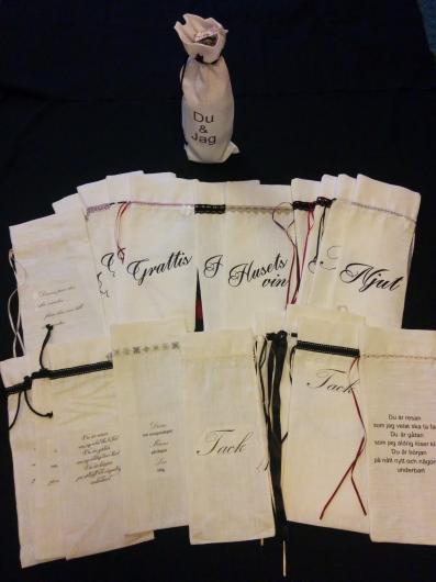 Först ut blev flaskpåsarna. Ett roligt sätt att göra det hela lite mer personligt. Och vill man går det alldeles ypperligt att beställa med egen valfri text. Passar till en flaska av ordinär storlek. Kostar 100 kr.