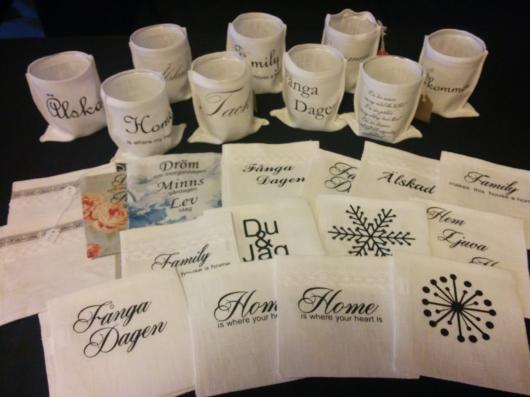 Sen har jag sytt ljuspåsar. Helt suveränt om man ska på middag och "måste" ha en liten present. Går att ge bort med en liten blomma i om man vill göra det ännu finare. Även denna går att beställa med valfri text eller symbol. Kostar 100 kr.