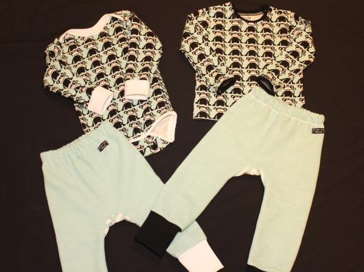 Ibland sover den lilla knatten lite extra så jag hinner sy lite mer än vanligt. Ett set i storlek 80 med body och byxor och ett i storlek 86 med tröja och byxor. Har haft dessa tyger i skåpen alldeles för länge utan att inse att de passade perfekt tillsammans.
