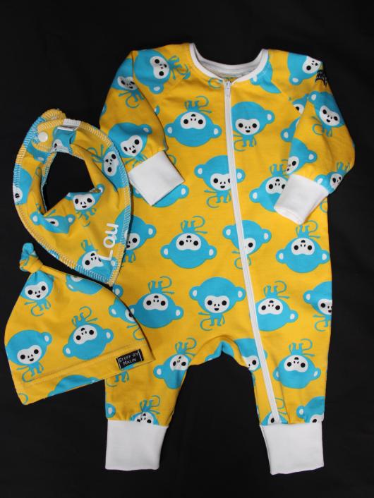 Ett beställt bebyset i de blå aporna. Jag tycker detta tyg är helt underbart. Settet är i storlek 62 och namnet på den lilla mottagaren fick pryda dregglisen.