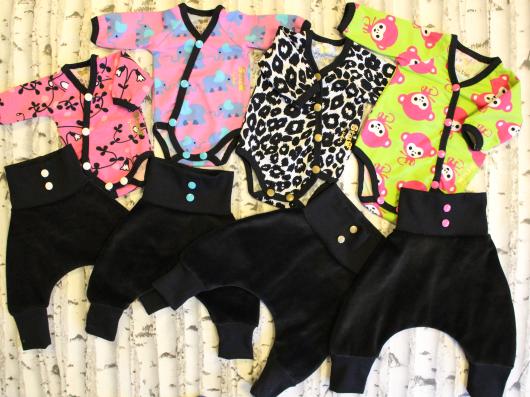 De mönster jag köpt är body, byxor och heldress i storlekarna 36/38, 40/42, 44/46 och 48/50. Bodyn är en fuskomlott med knärrning i grenen och fram så det ska vara enkelt att klä på, likaså med heldressen som har knäppning ända ner i ena benet. Byxorna och heldressen är lite baggy i modellen.