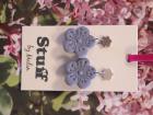 Örhängen tillverkade av polymerlera, pärlor och/eller metallberlocker av olika slag. Alla öronkrokar och stift är nickelfria. Smycken tillverkade av polymerlera är efter härdning i ugn mycket lätta och aningen flexibla.