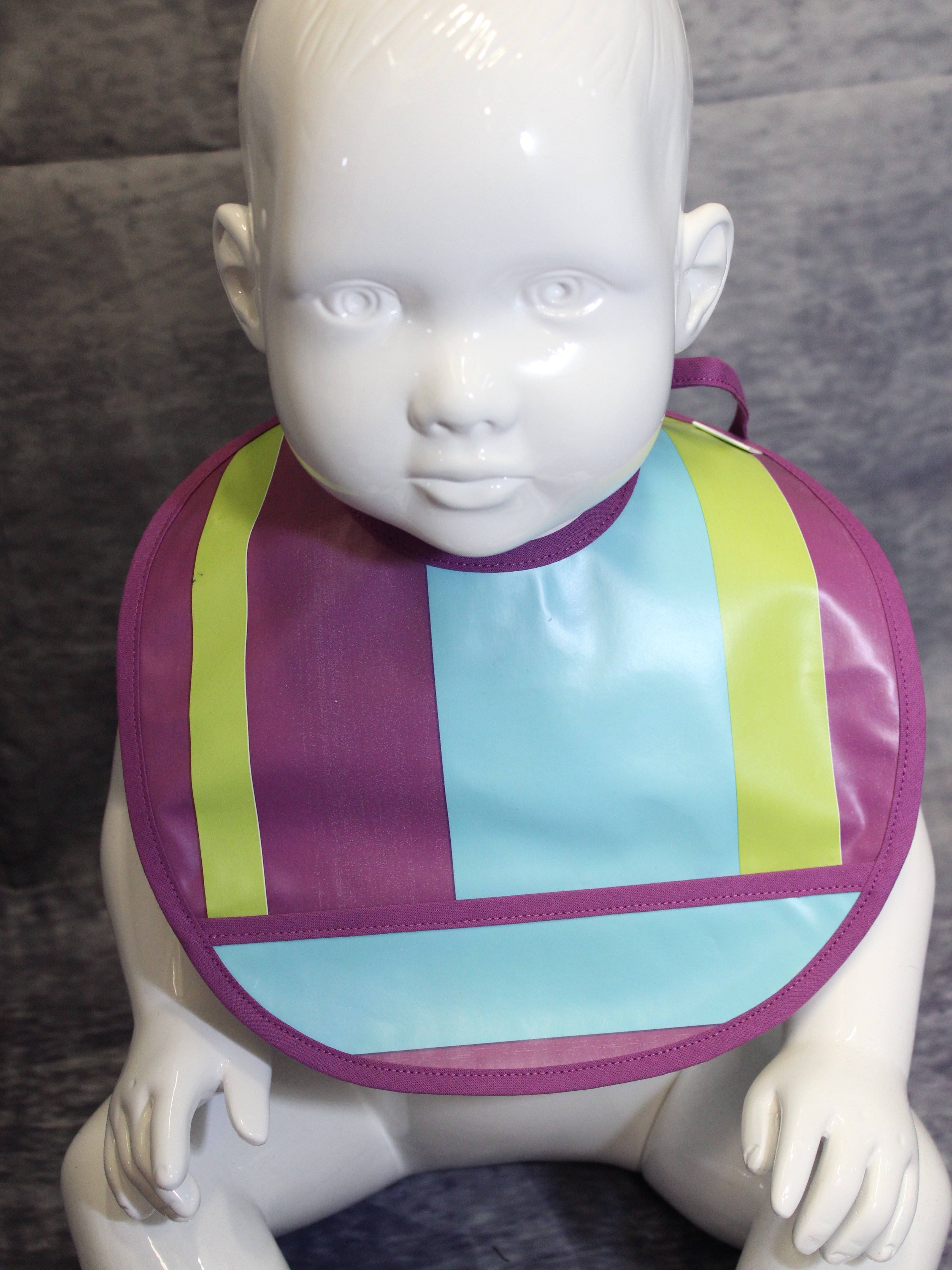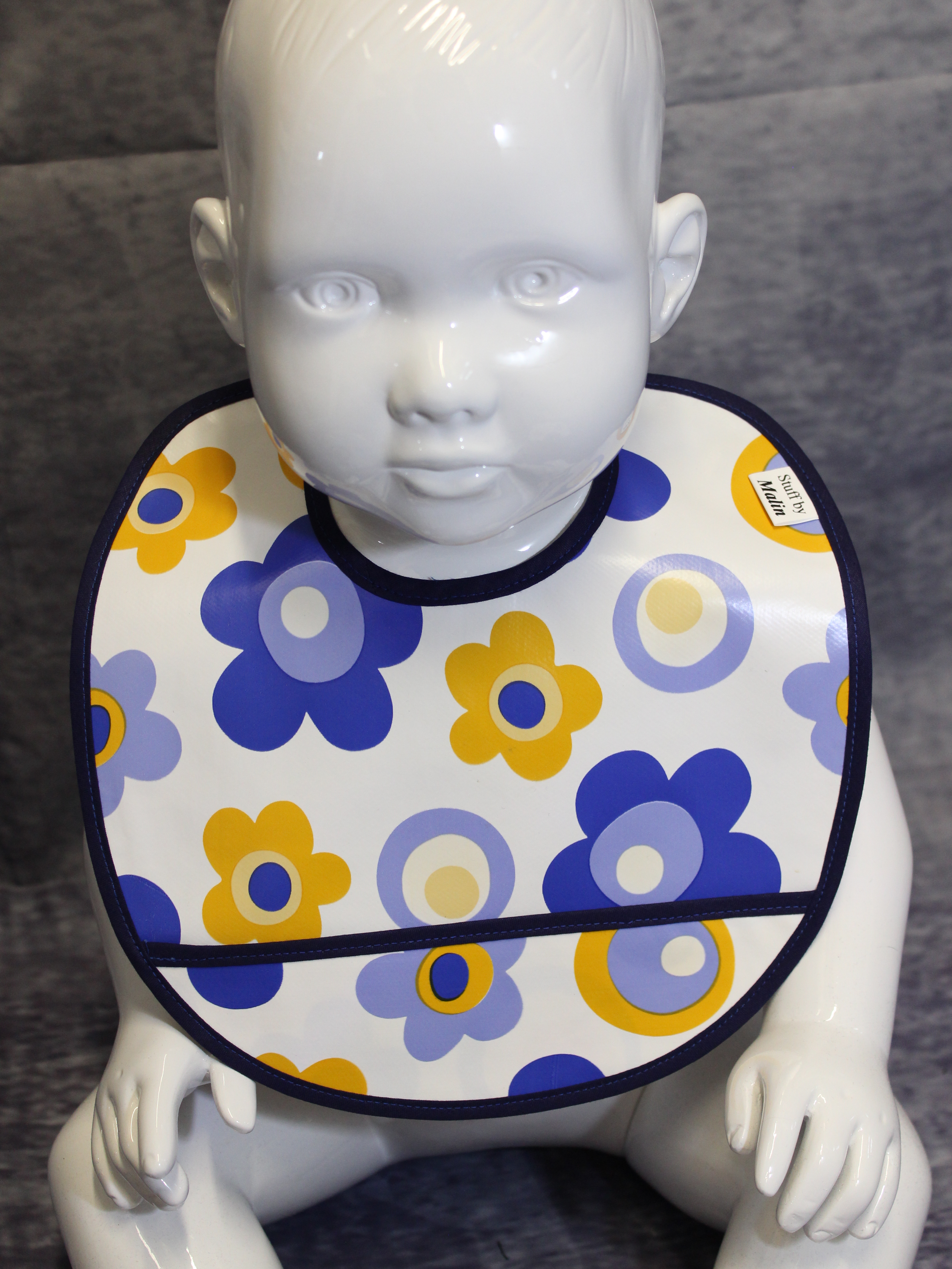 Gjorda av vaxduk eller vaxad bomull. Alla haklappar har ficka nedtill för att samla upp det spillda. Stängs med knytband. Kantband i bomull. Enkel att ha i skötväskan då den tar liten plats ihopvikt :)