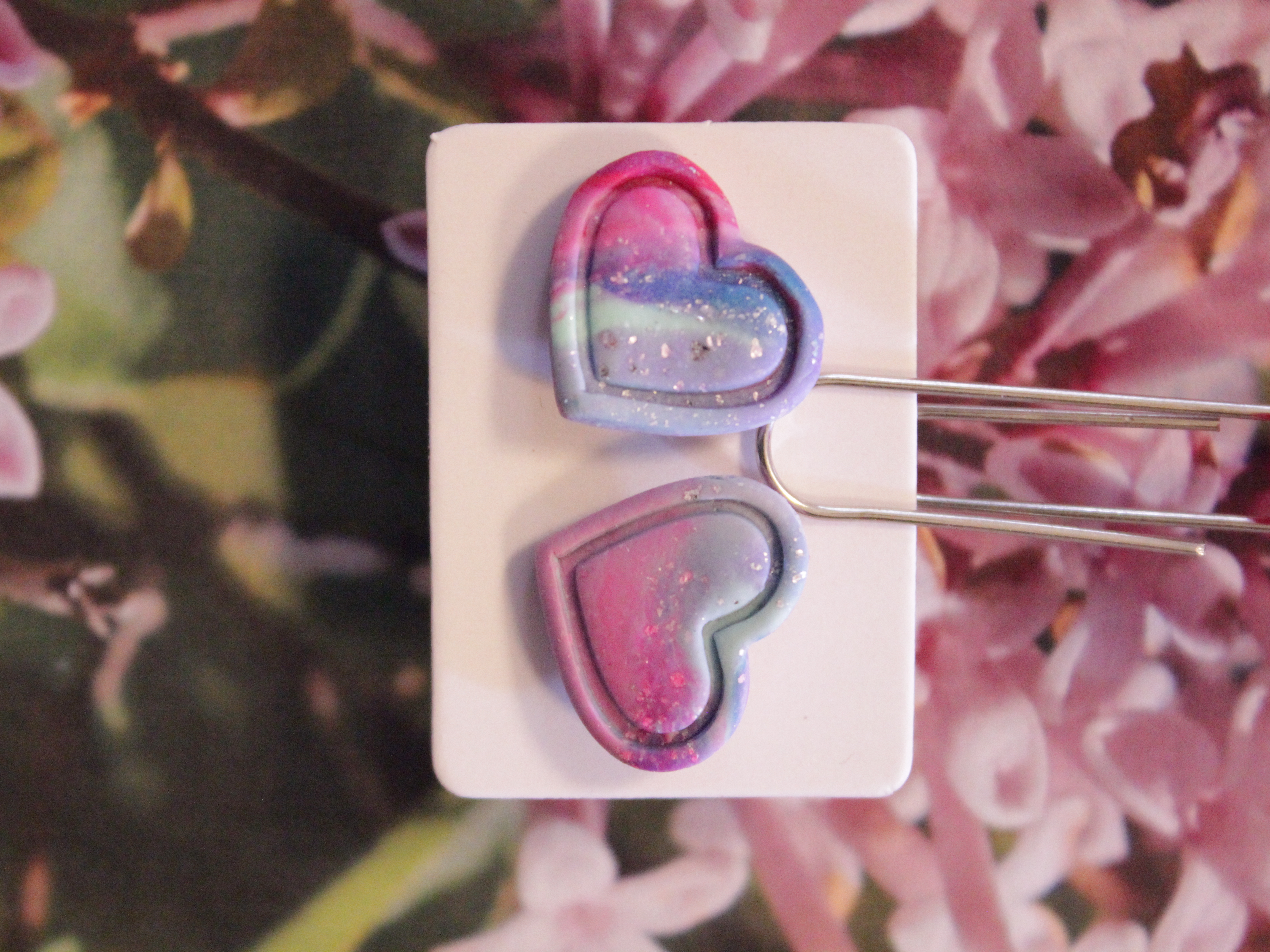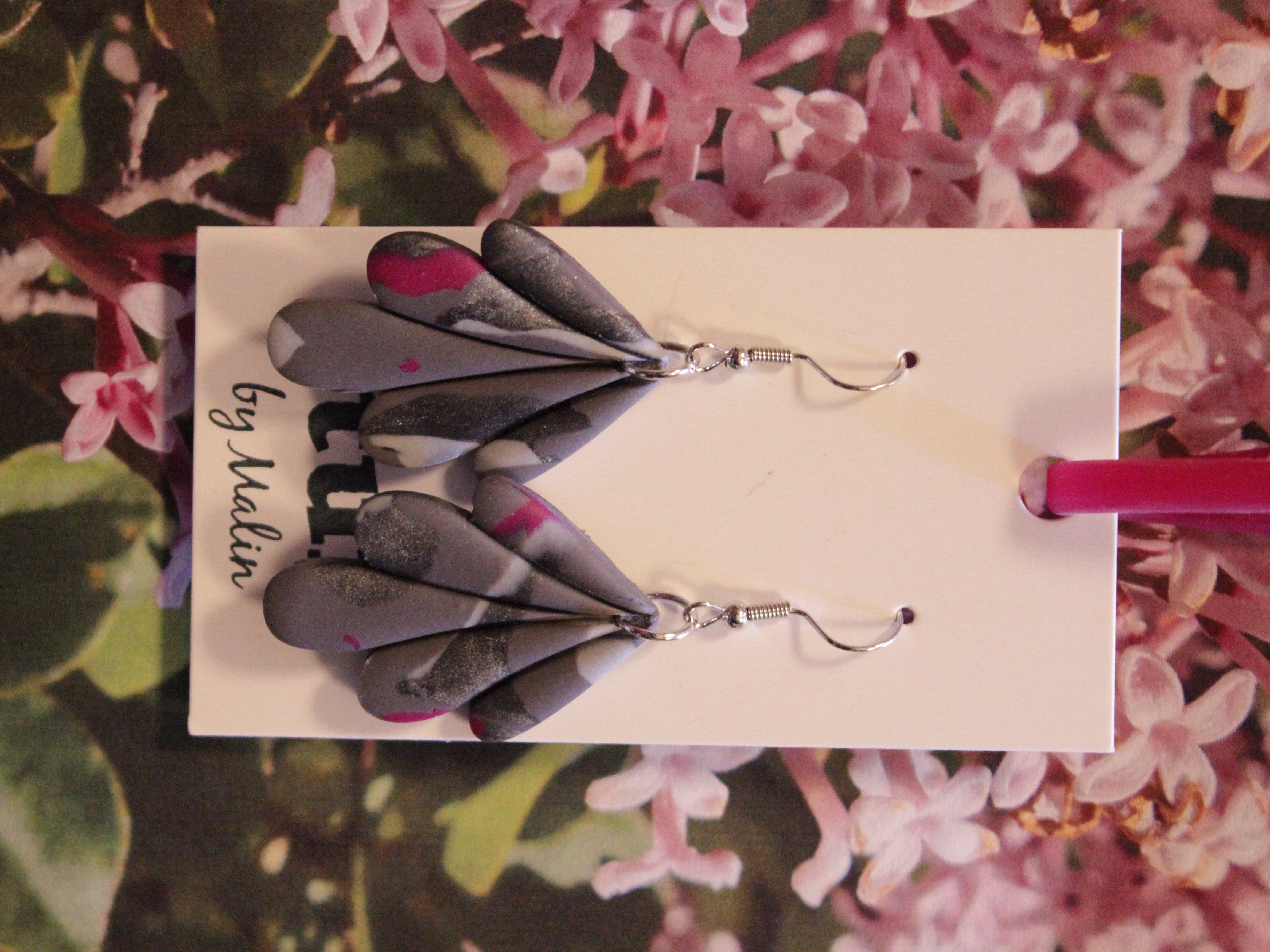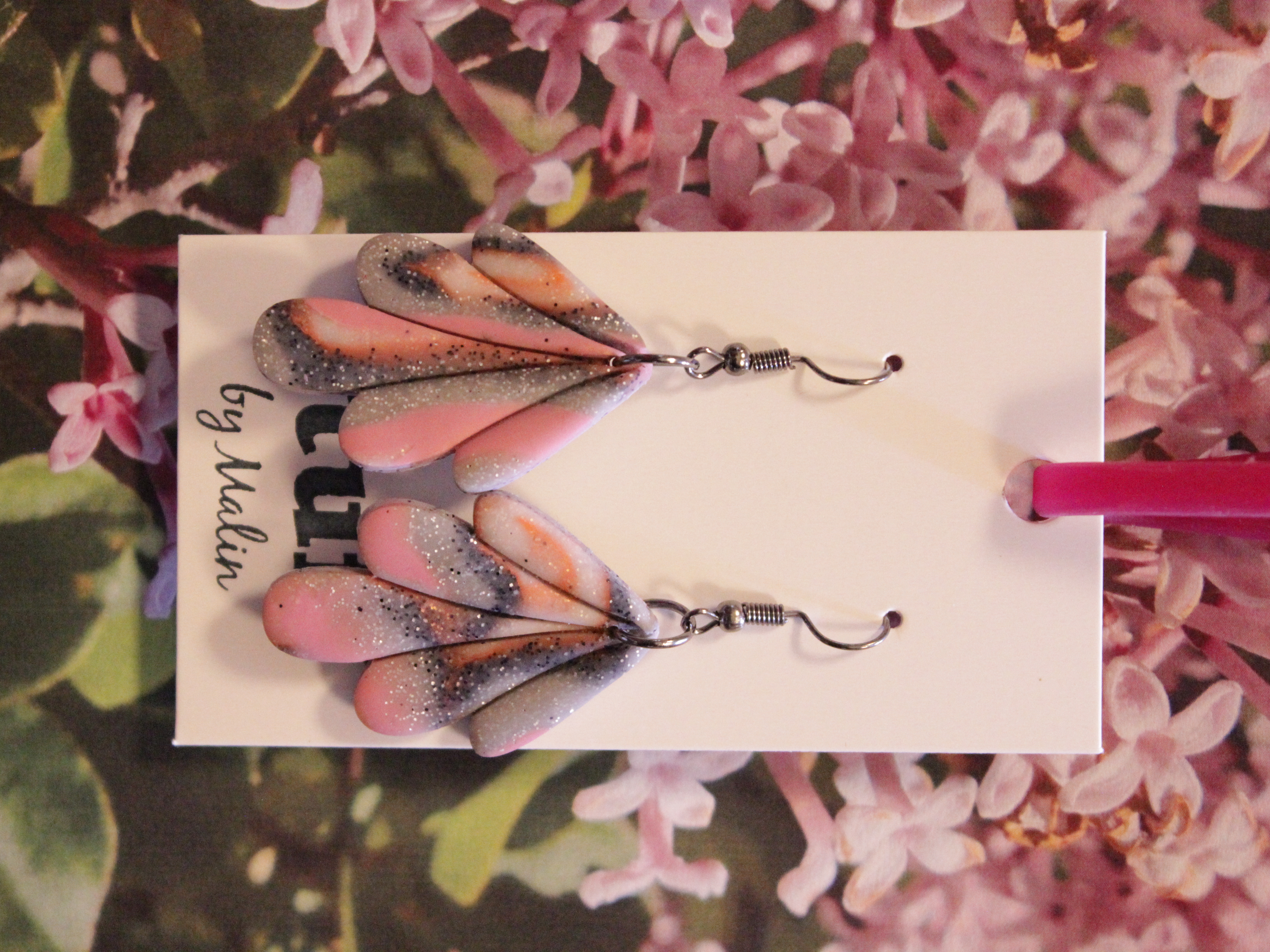 Örhängen tillverkade av polymerlera, pärlor och/eller metallberlocker av olika slag. Alla öronkrokar och stift är nickelfria. Smycken tillverkade av polymerlera är efter härdning i ugn mycket lätta och aningen flexibla.